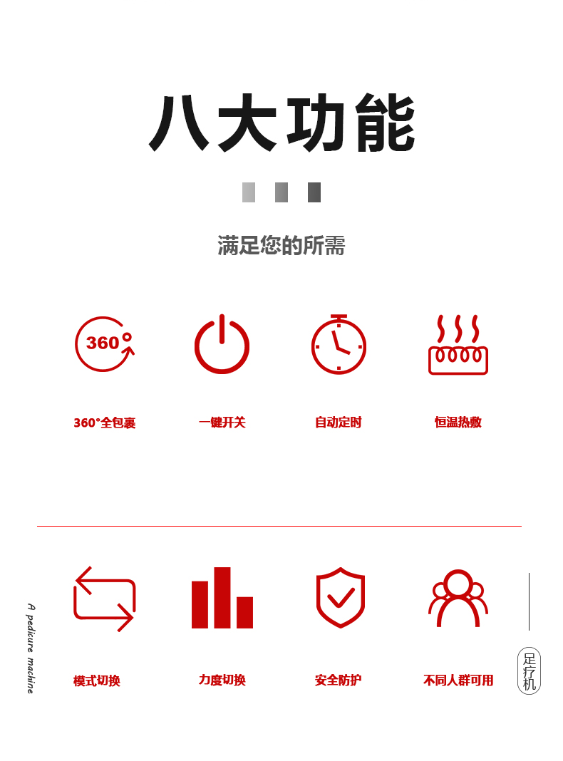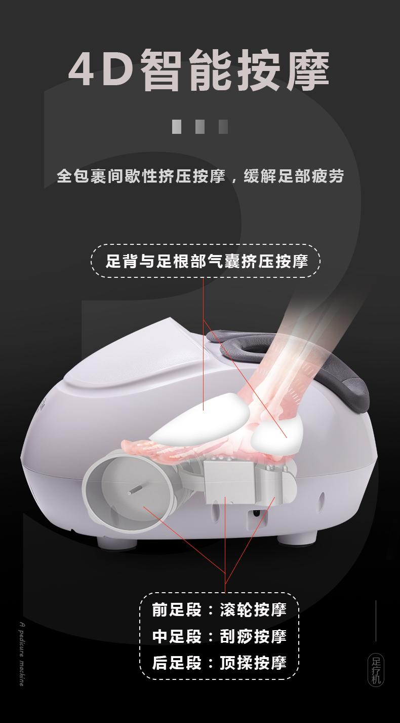 底壓機(jī)(腳趾),刮板(鞋底),Shiatus(腳跟)按摩(多模式,多強(qiáng)度)