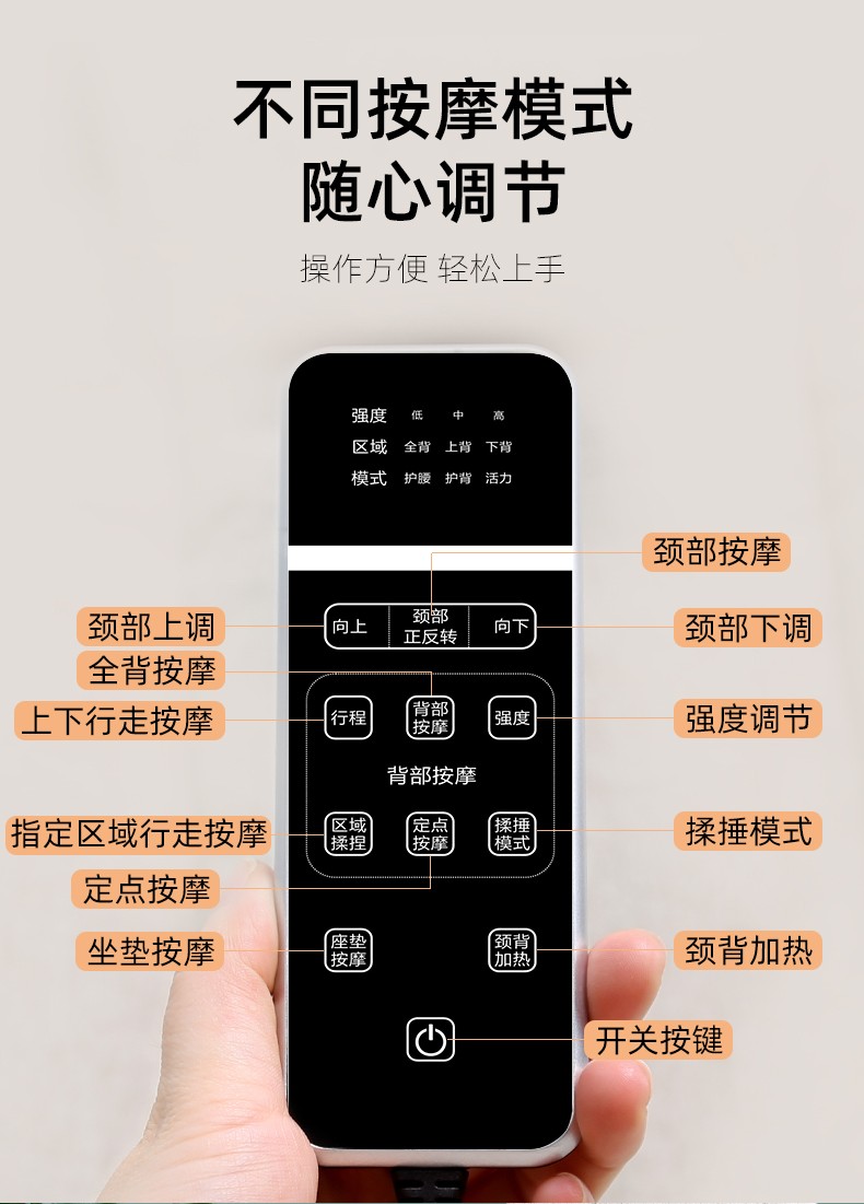 2.背部:上來來回按摩,有2組共4個(gè)揉捏按摩頭,有2組2個(gè)敲擊按摩頭。