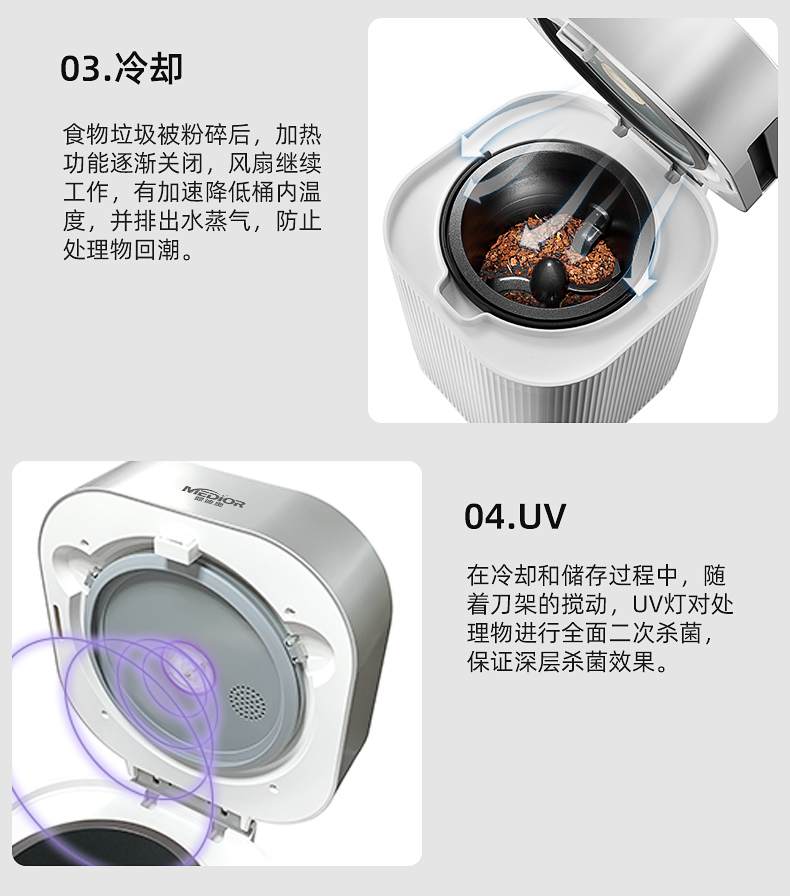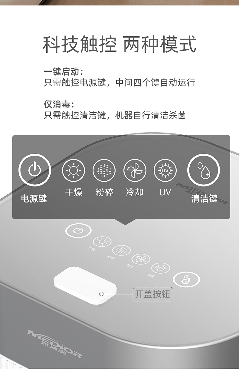 冷卻:研磨模式完成后,自動啟動冷卻模式。 電源按鈕和 干燥,研磨,冷卻燈及 紫外線燈點亮。 您可以在冷卻模式下設(shè)置UV周期。